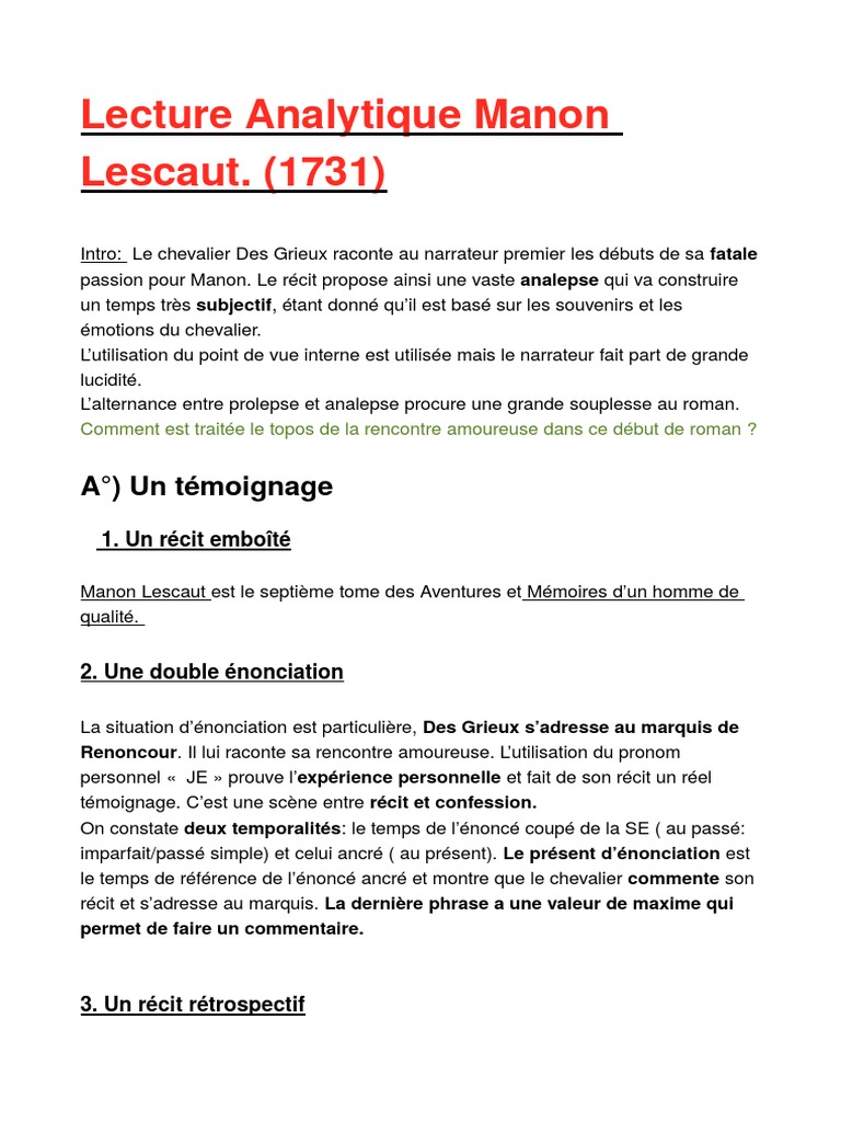 Manon Lescaut, l'abbé Prévost : fiche de lecture. Voici une fiche de lecture complète ( résumé et analyse) du roman Manon Lescaut de L' abbé Prévost au programme du bac de français avec le parcours « Personnages en marge, plaisirs du romanesque » . Manon Lescaut ne représente que le 7ème tome des Mémoires d'un jeune homme de.