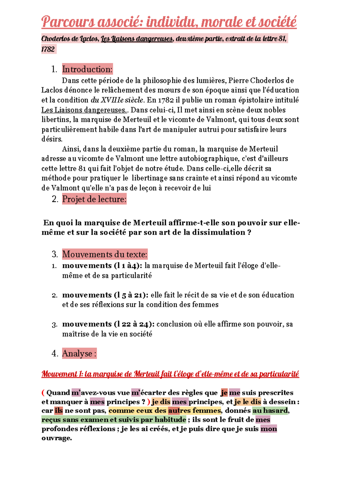 Fiche de Lecture Les Liaisons Dangereuses, Lettre 81 PDF