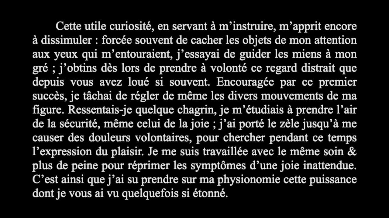 Choderlos de Laclos, Les Liaisons dangereuses, deuxième partie, extrait de la lettre 81, 1782. Dans la lettre 81, la marquise de Merteuil dévoile sa méthode en matière de libertinage et revenant sur son passé, livre une sorte d'autobiographie.