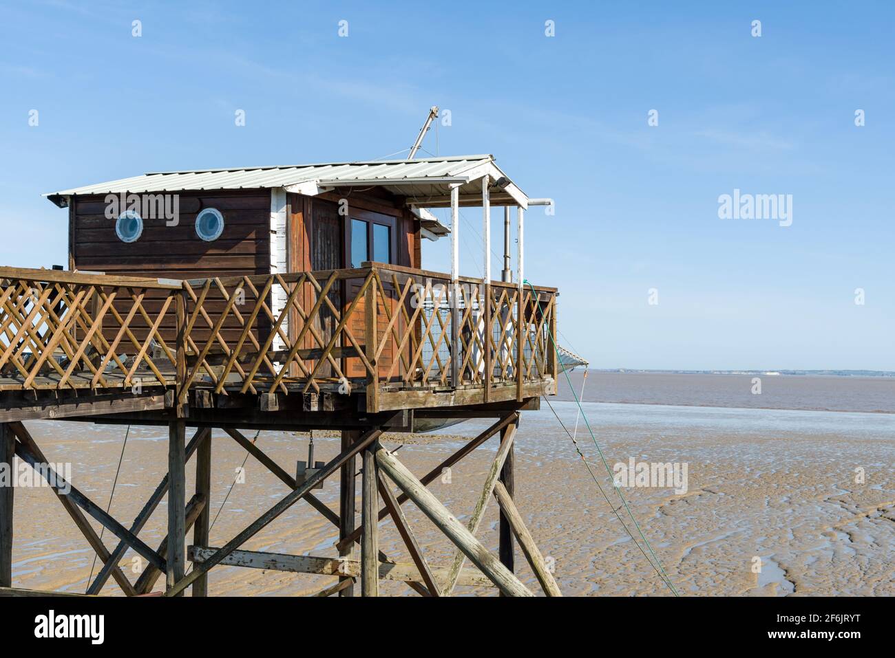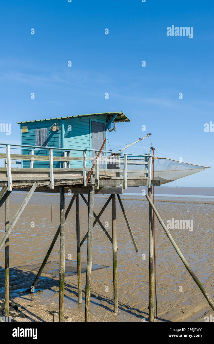 Médoc (France) cabane de pêcheur sur pilotis ou Carrelet au phare de Richard, estuaire de la