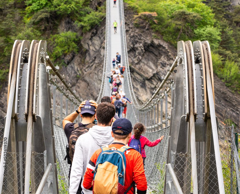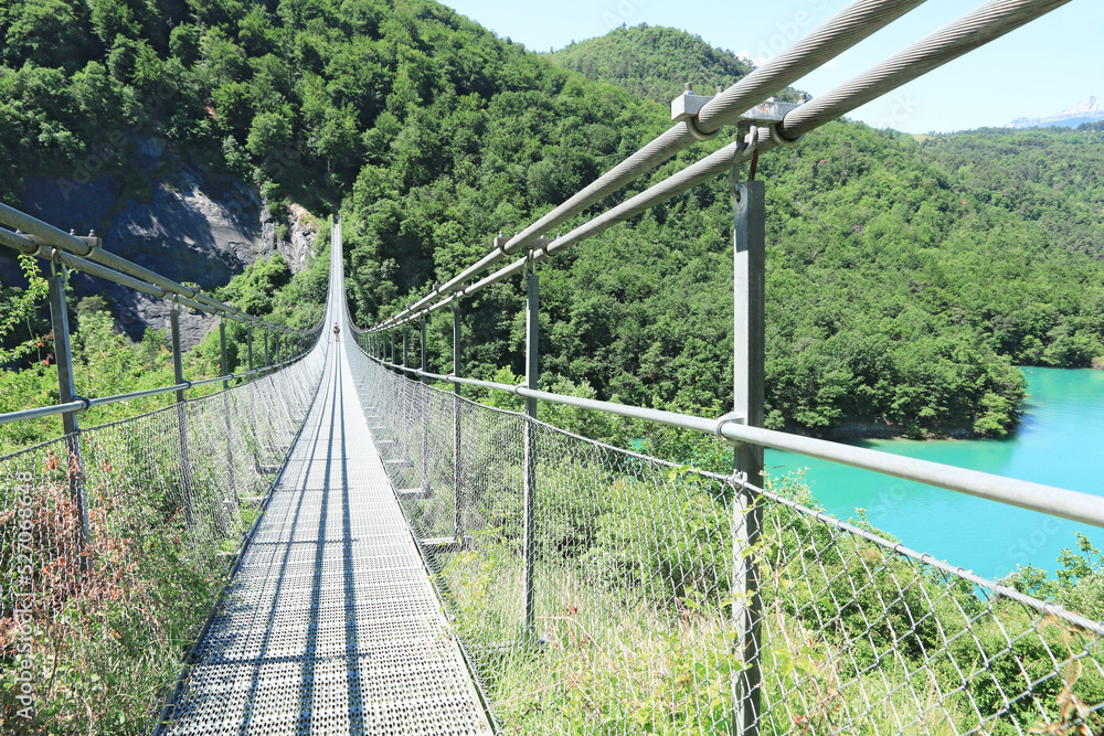 walkers crossing the passerelles du drac, a himalayan style suspension bridge over lac de