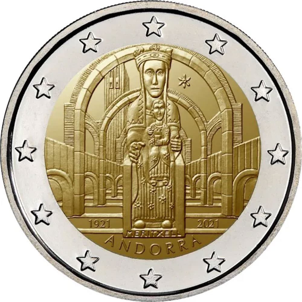 2€ Andorre 2021 "Notre Dame" Cette pièce de 2 euros commémorative commémore les 100 ans du couronnement de Notre Dame de Meritxell comme Sainte patronne d'Andorre Dépêchez-vous, le prix des euros d'Andorre commence à suivre le même parcours que les euros de Monaco et du Vatican.