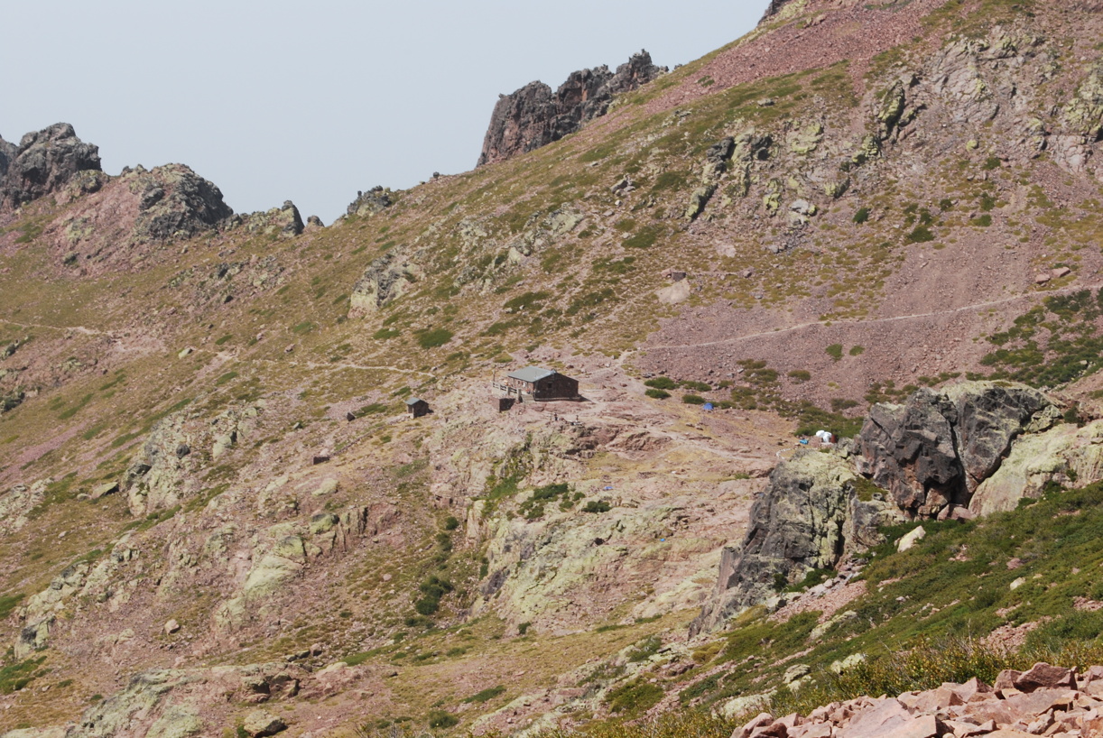 The path rounds the corner to finally get a view of the highpoint; Paglia Orba and the Refuge Ciottulu di i Mori which sits a few hundred metres below the peak. A final hundred meters steep ascent rewards you with the hut, where the owners will be happy to serve up local meets, cheeses or soup with a pitcher of wine.